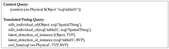 The query translation rules in Table 1 are divided into simple spatial queries not comprising time operators, spatio-temporal queries comprising time-point operators, and spatio-temporal queries comprising time-interval operators. First, for the context query translation rule for queries not comprising time operators, the most recent visual perception information of objects was retrieved and the query was translated into a Prolog query for verifying the spatial relation predicate from the poses of objects.