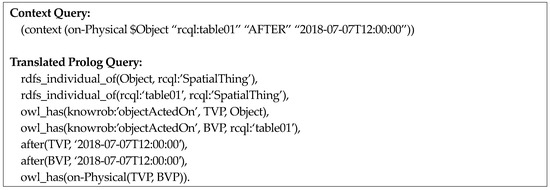For context query, KnowRob expands the semantic Web library of SWI-Prolog and supports the prolog predicates that can construct queries that include the valid time of knowledge. The main predicate for knowledge retrieval is holds; it can retrieve context knowledge valid at a specific time in the present or past. This is because it is possible to enter the context predicate and valid time of the triple pattern as arguments. However, in the holds predicate, the valid time can be entered only as a time point and only at is supported for time operator, resulting in very complex queries.
