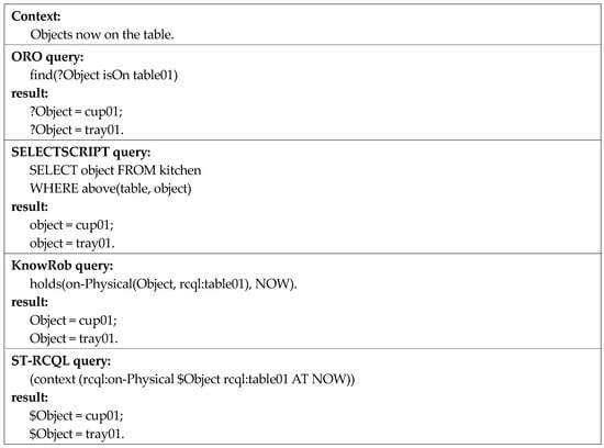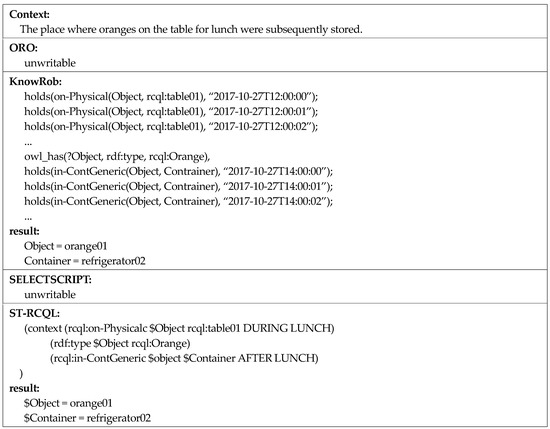 The third context is “The place where oranges on the table for lunch were subsequently stored.” To determine this context, multiple queries were constructed to find the oranges present on the table during lunch and then to find the place where they were stored after lunch. As in the second context, this third context also includes a past time point. Thus, ORO and SELECTSCRIPT cannot be used to write a query for this context. Although KnowRob can be used, it is still very inefficient. ST-RCQL can be used to write this query in only three lines. The first line finds the objects that were on the table, the second line selects oranges only among the objects present on the table at that time, and the third line finds the place where oranges were stored after lunch.