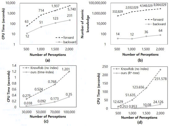Figure 19a shows the reasoning times of forward and backward reasoning depending on the number of visual perception instances stored in the working memory. All the visual perception instances were assumed to have the same valid time. Unlike backward reasoning, forward reasoning infers all possible context knowledge before querying; this requires considerable reasoning time. Furthermore, we determined that the reasoning time of forward reasoning increased exponentially with the number of visual perception instances. Figure 19b shows the volume of context knowledge inferred after forward and backward reasoning, depending on the number of visual perception instances stored in the working memory. Backward reasoning derives a very small volume of context knowledge, which it derives through reasoning among the inferred context knowledge by accessing specific context knowledge only. In contrast, forward reasoning derives a very large volume of context knowledge because it infers all possible knowledge and stores all the results. This results in an exponential increase in the volume of context knowledge with the increase in visual perception instances. In Figure 19b, the space occupied by approximately eight million triples of context knowledge in the memory, which was derived at the maximum, is approximately 1.5 GB. Visual perception instances obtained using the RGB-D camera are generated at the rate of approximately 10 frames per second. Therefore, approximately three minutes and 20 seconds is required to occupy 1.5 GB of memory. Furthermore, robots also obtain other perception information in addition to visual perception instances, and thus the memory capacity for forward reasoning is practically impossible to meet. Although not shown in the results of the two experiments in Figure 19a,b, to actually apply forward reasoning to robots, it must be performed ceaselessly whenever the perception occurs. This reasoning method is inappropriate for service robots that must work in real time.