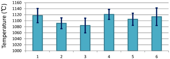 Standard deviation of the temperature sampling error of different steel grades from the rough mill: (1) general structural steel; (2) hull structural steel; (3) high strength low alloy steel; (4) container sheet; (5) carbon structural steel; (6) hot-rolled alloy steel coil. Data were provided by LiuSteel in China.