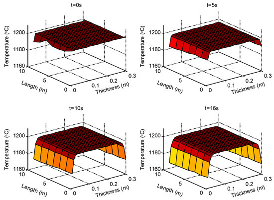 We start by presenting the visualized results of the slab temperature distribution during the transferring process. Figure 5 captures the temperature distribution estimations of the steel slab at different time instants. The transfer of the slab along the section between the reheating furnace and the rough mill consumes about 16 s. During the transfer, the slab continuously loses heat to the air which results in gradual temperature descending. The subfigures in Figure 5 show the temperature descending process of the slab estimated by CSE. From the beginning, the furnace sends the slab to the transferring belt with a even temperature distribution at . As the slab is transferred, the temperature of the layers on the surface descend, but the temperature of the layers inside the slab (about covering the thickness of 20 cm) is almost not affected by the surface heat lost within the time used for intersection transferring. In the final distribution, the temperature of surface descends to about . Note that subregions of the slab have slightly differentiated temperature distributions due to the different arrival times at the rough mill. The gap of the surface temperature between the first subregion and the last one is about .