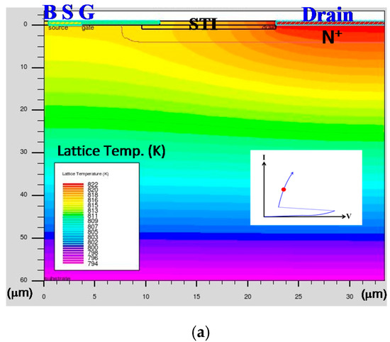 The value of the It2 component is actually the maximum current that can be conducted before the component reaching the physical melting point—that is, the last moment before the component is destroyed. Therefore, the lattice temperature of a DUT in a simulation is related to the ESD capability value. If a component’s lattice temperature is higher as the bias conditions in simulation are kept the same, it means that this tested sample will be less resistant to a high ESD current. Figure 11 presents the lattice temperature distribution of 60-V nLDMOS devices by the (a) reference DUT, (b) drain-side parasitic SCR n-p-n-arranged type, and (c) drain-side parasitic SCR p-n-p-arranged type. Clearly, the parasitic SCR structures in Figure 11b,c had low on-resistance under the same drain trigger conditions, and thus had the characteristic of low power consumption (with more lower-lattice-temperature distributed profiles), and eventually they could discharge higher ESD currents. For Figure 11c especially, the nLDMOS with a drain-side parasitic SCR p-n-p-arranged type has a shortest conduction path for the SCR, with obvious SCR characteristics. In other words, it is found from the lattice temperature distribution diagram of Figure 11a that the reference sample has higher lattice temperature profile than the n-p-n-type or the p-n-p-type, and the high lattice temperature regions will concentrate on the entire drain region. As shown in Figure 11b,c, it is found that the lattice temperature distribution of the p-n-p-type is lower lattice temperature profiles over the entire flow path than the n-p-n-type. Unlike the n-p-n-type high lattice-temperature profile, the p-n-p-type profile has a lower lattice temperature distribution in the drain region. Therefore, the TCAD simulation results also confirmed that an nLDMOS parasitic SCR with a p-n-p-arranged type will more effectively enable the protective component, in order to discharge the ESD current.