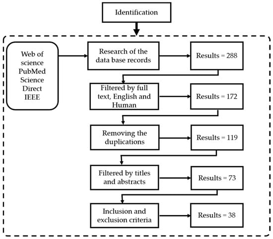 After carrying out the search procedures using the defined search-terms, this study identified 288 papers. Out of this number, 116 papers were filtered out by the criteria full text English and studies related to humans. The remaining 172 papers were duplicates and were appropriately removed through use of the Mendeley software. After the duplicate papers were removed, focusing on each paper’s title and abstract, 53 additional papers were removed. Then, the inclusion/exclusion criteria were applied to the remaining 73 papers. After reading the full text of the remaining papers, a total of 35 were excluded, leaving 38 papers for this research.