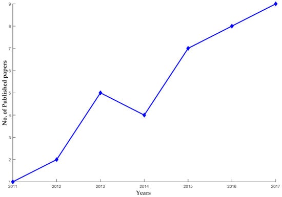 As a result of the systematic review, a total of 38 papers were finally chosen as principal studies, published within the field of research regarding EEG-based control for human limb exoskeleton as listed in Table 2 and Table 3. In order to emphasize more on how the EEG-based control field got more attention in the recent years, Figure 3 illustrates the chronological distribution of the selected papers in the interval of 2011 to 2017. The publication distribution shows the increase of the research papers with time, for instance, two papers were published in 2012, four papers in 2014 and the numbers dramatically increased from 2015–2017.