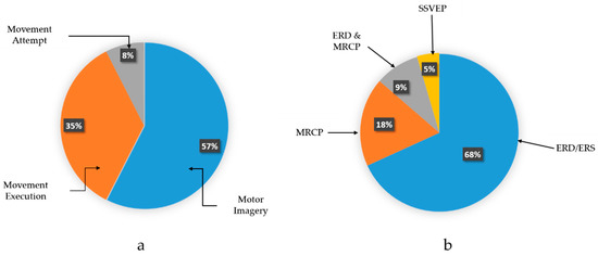(a) Percentage of movement’s tasks and (b) Percentage of EEG signal type utilized in the selected studies.
