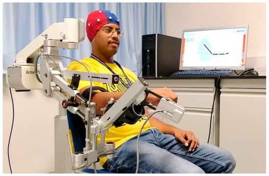 The feasibility of three-dimensional robotic assistance for upper limb reaching motions with a multi-joint exoskeleton during MI-ERD of sensorimotor oscillations in the β-band has been evaluated in [44]. In addition, task-related networks modifications of cortical activation connectivity in the basis of EEG were measured. In this experiment, the active upper limb exoskeleton (ArmeoPower, Hocoma, Volketswil, Switzerland) was employed. A similar setup but using ArmeoSpring at SMART Lab, UTP is shown in Figure 6. This robot is a multi-joint exoskeleton for shoulder, elbow and wrist joints with seven degrees of freedom. All participants including healthy and stroke survivors carried out their optimum performance during the initial phase of the experiment. Cortical network distribution of task-related coherence activity in the θ-range revealed a considerable difference between stroke patients and healthy subjects in addition to the variation in the late and early phases of the experiment.