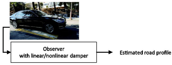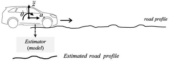 Figure 1 shows the concept of the road profile estimation. For straight driving, the main excitations of the vehicle’s dynamic responses are the vertical displacement of the tire-road contact points and the longitudinal acceleration. This information is used to estimate a road profile using measured IMU signals.