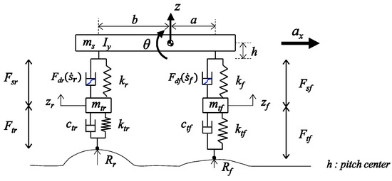 where sf and sr are the front and rear suspension strokes, respectively; and Rf, Rr and their time-derivatives are unknown inputs to the vehicle dynamics. These unknown inputs are determined by the road profiles and the vehicle velocity, and they cannot be easily measured using conventional sensors. y is a vector of the measurement signals and is a tuple of the pitch rate and vertical acceleration signals from the IMU sensor.