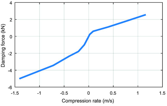 To capture the vertical and pitch dynamics, we consider a typical half car model, as shown in Figure 2. The tire and the suspension are modeled as spring-damper systems, but the damper of the suspension is modeled as a non-linear system. The nonlinearity of the suspension damper is one of the most significant factors in the accuracy of the estimation results. Therefore, the nonlinearity of the suspension dampers is explicitly considered in the model design. The damping force model is shown in Figure 3.