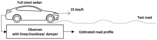 The experimental validation was performed using a speed bump, as shown in Figure 6. A full-sized sedan was driven on the speed bump, and the profile of the speed bump was measured using the ad-hoc device shown in Figure 7. The estimated results are plotted in Figure 8. The black line presents the measured profile. The observer with the nonlinear damper model provided more accurate estimates, especially after the vehicle ran over the bump. This occurred because a linear damper model would show a significant discrepancy from a true damper when the suspension stroke velocity is high. A high suspension stroke velocity usually occurs at sudden road profile changes such as speed bumps or pot holes.