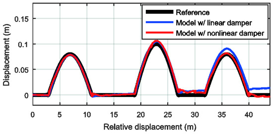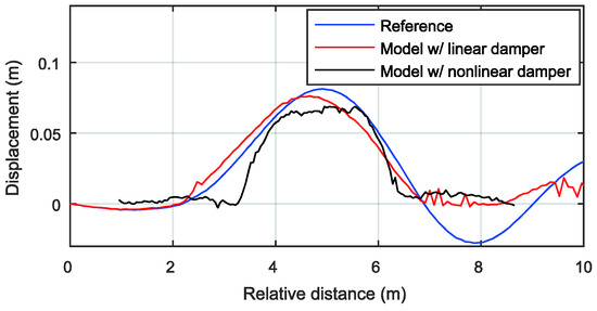 We verified the estimation algorithm with a simulation and experiments. The simulation was performed with the virtual measurements vehicle dynamics simulation software Carsim® (Mechanical Simulation Corporation, Ann Arbor, MI, USA). The vehicle was a full-sized sedan running at 25 km/h on a simple road profile, as shown in Figure 4. Figure 5 shows the road profile estimation results obtained using the system model with linear dampers and nonlinear dampers. The measurement signal does not have any noise or bias, so the error in the estimation mainly comes from the model error. Therefore, the result with nonlinear dampers shows a higher accuracy than the result with linear dampers.