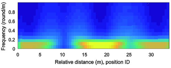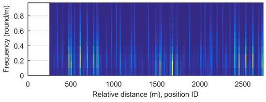 Unique and robust features are required to identify a specific location. The spectrogram shows the features of road profiles as an image in the time-frequency domain. By transforming a road profile to a spectrogram, we can apply various image feature extraction methods. Furthermore, we can extract robust features even when there is noise because the spectrogram has two feature dimensions: time and frequency. However, the vehicle speed affects the road profile distribution if the estimated road profiles are expressed in time. Therefore, we transform the road profile indexed in time into one that is indexed by the accumulated distance. By generating a spectrogram in the distance-frequency domain, the time dependency is removed. Figure 9 shows a spectrogram with the estimated road profile result from Figure 5. This spectrogram was generated with a moving window with dimensions of 10 m × 1 round/m. The color changes in the figure represent the road profile changes.