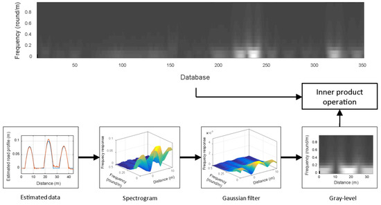 The second part for localization is to match the road profiles between the estimated one and the pre-indexed one in the database. The immunity to noise is improved by a feature extraction method. We extract the features of a road profile in the frequency-distance domain. Characteristics are more clearly presented in the frequency domain than in the time domain, so we adopt a spectrogram technique for feature extraction [31]. A spectrogram is a two-dimensional plot in the time-frequency domain, so the characteristics of signals are displayed with richer information. Another benefit of a spectrogram is the easy rejection of measurement noise. In addition, by using the spectrogram, we can use image processing techniques for feature matching because the spectrogram is displayed in a two-dimensional domain.