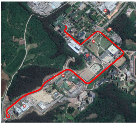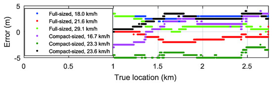 Kuutti recently surveyed the state-of-the-art localization techniques [35]. He summarized that the localization techniques based on only one on-board sensor as a standalone offer a low accuracy and robustness for autonomous vehicles. The only GPS-based localization has under a 10 m accuracy [35], the only radar-based technique has an average accuracy of 10.5 m [36], and even the only camera-based localization has up to 20.5 m cumulative error [37]. The fusion techniques with vision sensors have under a meter accuracy; however, these techniques are vulnerable to illumination, the observation angle, the weather condition, and dynamic environments. The integrated GPS and IMU sensor localization technique has a relatively low accuracy of 7.2 m and error accumulation problem [38]. Another error-accumulation-free IMU-based localization method [21] has about a 5~10 m accuracy and estimation error deviations are large due to the signal noise. On the other hand, the suggested localization method has under 5 m error without an error accumulation problem using only an IMU sensor. Therefore, the suggested method can be applied as an alternative localization technique.