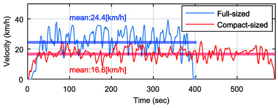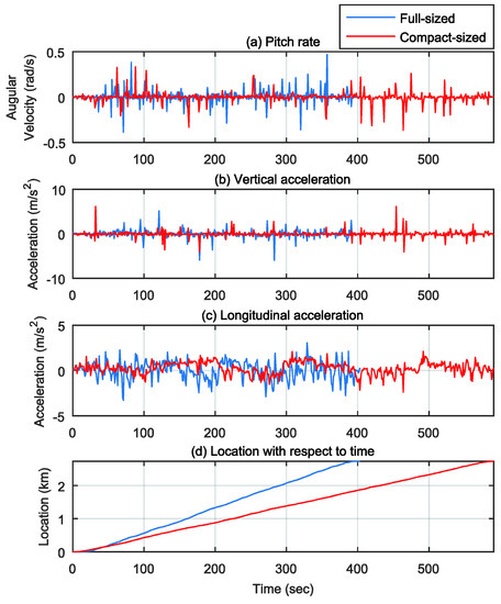 To verify the localization method, we drove two different cars on the same road: a full-sized sedan and a compact sedan, as shown in Figure 11. The vehicle velocities are shown in Figure 12. The full-sized sedan ran at about 24.4 km/h, and the compact sedan ran at about 16.7 km/h. Figure 13a–c show the pitch rate, vertical acceleration, and longitudinal acceleration signals measured through the IMU for both cases, respectively. The signals in Figure 13a,b are the output y, and the signal in Figure 13c is the known input u in the estimator for the road profile. Figure 13d shows the driving distance with respect to time for both vehicles.