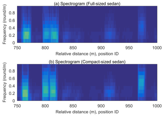 Figure 15. Spectrogram at 750–1000 m: (a) Full-sized sedan; (b) Compact-sized sedan.