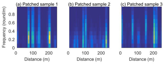 The estimated road profile from the full-sized sedan was used as a pre-indexed database, and that from the compact sedan was used as the test signal. Figure 16 shows the spectrogram transformed from the estimated road profile obtained with database signals with a window size of 250 m for the spectrogram generation. Figure 17 presents the spectrogram of the test runs obtained with this window. The localization was implemented by scanning the database spectrogram for the spectrogram of test signals. For example, for the spectrogram image obtained from the test vehicle shown in Figure 17a, the current position is about 400 m in the database index. In the same way, Figure 17b shows the image for 1450 m, and Figure 17c shows the image for 2200 m in the database index. The localization results for the total test signals are plotted in Figure 18.