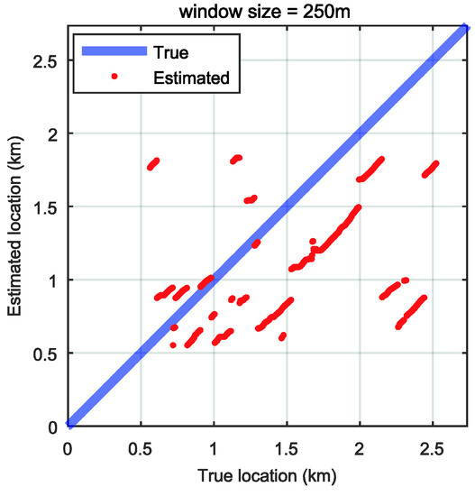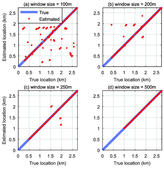 Figure 18. Localization result: (a) Window size = 100 m; (b) Window size = 200 m; (c) Window size = 250 m; (d) Window size = 500 m.