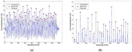 Experiment Results of Peak Detection Algorithm. (a) Overall Step Detection Results; (b) Step detection result of partial enlargement.