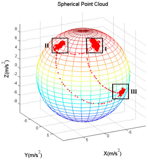 where means earth gravity vector, are the gravitational acceleration vector components of x, y, and z axes of the smartphone. If the three-axis gravimeter data are projected into a three-dimensional coordinate system, a sphere can be realized, and a spherical point cloud can be seen in Figure 5. In this Figure, each point represents the data of a sampling point. And the radius of the sphere is the local gravitational acceleration value. In addition, area I, II, III represent the gravity data projection of Mode 1, Mode 2 and Mode 3 respectively. From Figure 5, we can find that the gravitational output data in different mode is projected in different areas, which means that the using-mode of the smartphone can be distinguished, by calculating the azimuth and elevation angle with the gravimeter data.