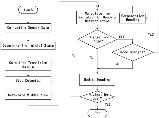 Based on the study of the relationship between three using-modes and the data of the smartphone, a new method to compensate the heading is proposed in this paper. The general process of this method is shown in Figure 6. A specific process has been divided into the four steps as mentioned below.