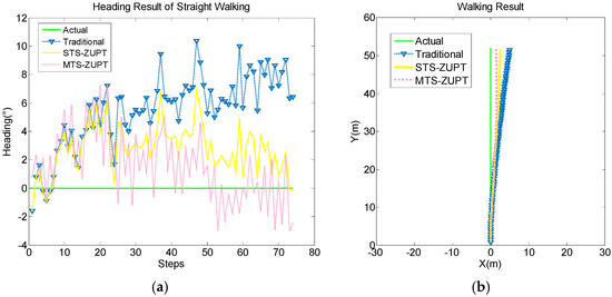 Straight Walking Result Comparison of MTS-ZUPT and STS-ZUPT. (a) Heading result; (b) Route result.