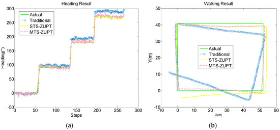 Rectangular Walking Result Comparison of STS-ZUPT and MTS-ZUPT. (a) Heading result; (b) Route result.