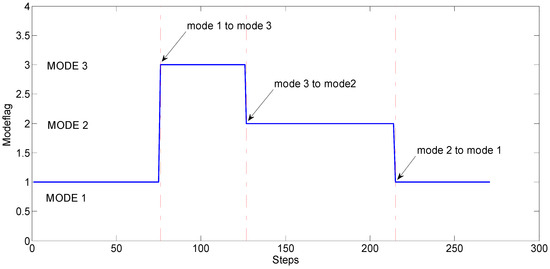 In this section, the experiment has been carried out in the corridor of CAE. The walking route is similar as former experiment route, a closed rectangular. The three using-modes mentioned in Figure 4 are demonstrated when walking, and the using-mode changing order is: from mode 1 to mode 3, then to mode 2, and back to mode 1. The traditional PDR algorithm, PDR/GA algorithm, MTS-ZUPT algorithm and the MTS-ZUPT/ GA algorithm are applied to deal with the collected data. Figure 10 shows the using-mode judgement result of smartphone by GA algorithm. The red point-dotted lines represent the moment when the using-mode changes. From Figure 10, we can see that three using-modes are distinguished successfully with 100% accuracy.