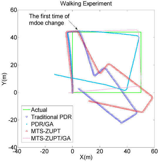 The walking track results are shown in Figure 11. The green solid line represents the actual walking trajectory; the blue lower triangle and the red upper triangle represent the PDR algorithm and the MTS-ZUPT algorithm results. The blue dotted line represents PDR/GA algorithm result, the red dotted line represents MTS-ZUPT/GA algorithm result.