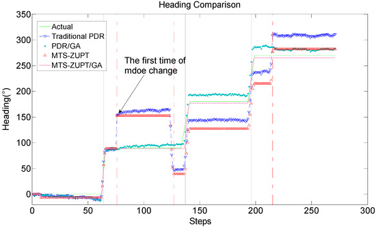 Figure 12 shows the heading value curves of the four algorithms. Among them, the gray solid lines represent the turning moment of the experimenter during walking, and the red point-dotted lines are the using-mode changing moments. It can be clearly seen from Figure 12 that the GA algorithm does not affect the change of heading when the pedestrian normal walks and turns. However, once the using-mode has been changed, the algorithms without GA will output the wrong heading angles. With the help of GA algorithm, the navigation system can compensate the heading angle by judging the using-mode. Moreover, the heading result obtained by the MTS-ZUPT/GA algorithm is better than the heading result of the traditional PDR/GA algorithm.