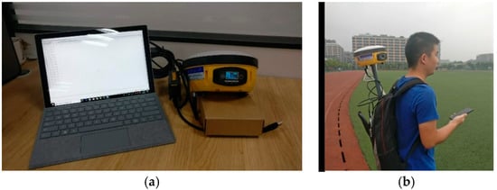 DGPS Device and the Wear Mode of Playground Experiment. (a) The DGPS device and the data storage device (Surface tablet PC); (b) The specific equipment for playground experiment.