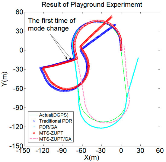 The experiment result is shown in Figure 14. The green line is the positioning trajectory of DGPS. During the whole experiment, there are three using-mode changes, the first moment using-mode change point is marked in the Figure 14. We can find that this experiment result is very similar to the result in the corridor of CAE. Overall, the differences between the result of MTS-ZUPT/GA algorithm and the positioning trajectory of DGPS is minimal. In this situation, both the start and end points are (0, 0). The final end point of MTS-ZUPT/GA algorithm is (4.70, 6.92), the error is 2.0% for the walking distance of 400 m. The final end point of PDR/GA algorithm is (26.44, −12.2). The experimental results show the superiority of the MTS-ZUPT/GA algorithm compared to the other algorithms.