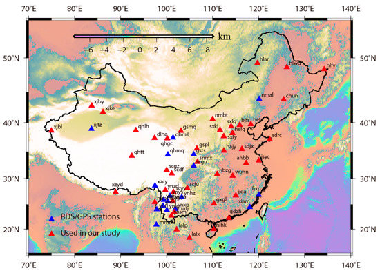 The distribution map of the station deployed with BDS/GPS dual mode receivers. The blue and red solid triangles represent the location of BDS/GPS dual-frequency stations, with the total number being 62. The red solid triangles are stations analyzed in this study, with the number being 44 and their data integrity being over 95% in the period of the analysis.