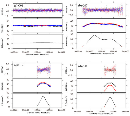 The multipath delay (MPD), signal to noise ratio (SNR) of BDS and GPS satellite systems at station YNSM, and the variation of their elevation angles with respect to time. (a) C01 (GEO), (b) C07 (IGSO), (c) C13 (MEO) and (d) G11 (GPS) are selected as typical examples on behalf of different satellite types. Different colors represent different frequencies. Red circle, black circle, and blue circle represent signal B1, B2, and B3, respectively, in (a–c). Red circles and Black circles represent the signal L1 and L2, respectively, in (d).