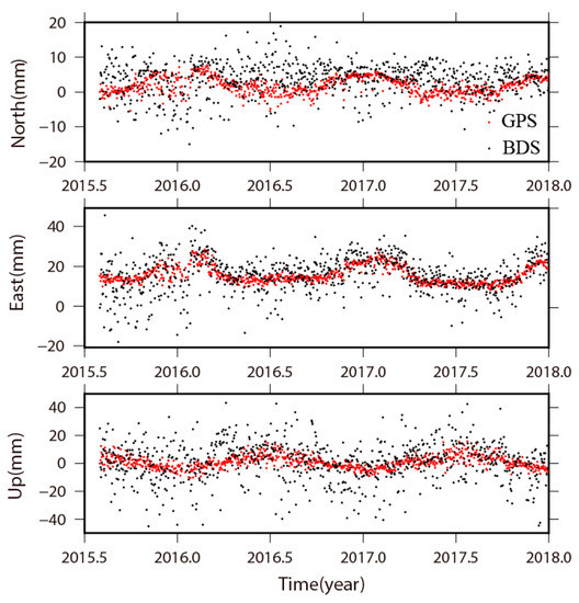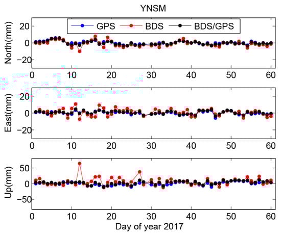 Figure 4 shows the residual position time series of station YNSM, which are derived from BDS, GPS, and BDS/GPS data, respectively. Three residual time series show similar steady temporal behaviors, especially for the GPS and BDS/GPS results, which are nearly complete coincidence. The BDS residual time series has the large temporal dispersion and contains several abnormal jumps, which is not found in GPS or BDS/GPS results.