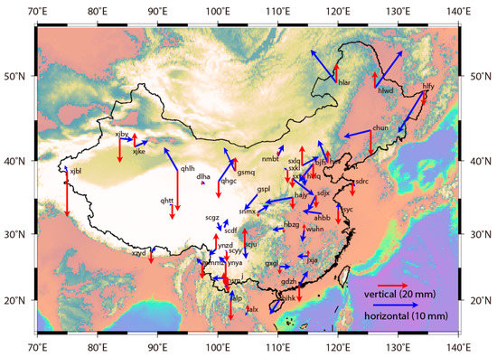 - Liang, S.M.; Gan, W.J.; Shen, C.Z.; Xiao, G.R.; Liu, J.; Chen, W.T.; Ding, X.G.; Zhou, D.M. Three-dimensional velocity field of present-day crustal motion of the Tibetan Plateau derived from GPS measurements. J. Geophys. Res. 2013, 118, 5722–5732. [Google Scholar] [CrossRef]