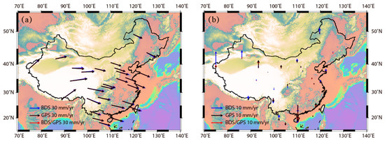 The velocity fields aligned to the ITRF2014 reference frame for BDS, GPS and BDS/GPS combined results, are presented in Figure 7. It is negligible for the differences between GPS results and BDS/GPS combined results. However, they are remarkable for the differences between GPS velocity field and BDS velocity field, with maximum horizontal differences reaching up to 1.6 mm/year, which is similar with the estimated accuracy of BDS velocity field. The values of vertical differences are less than the vertical accuracy of BDS velocity field at 27 stations, and the direction of vertical differences are also randomly distributed, thus indicating that it is insufficient to derive precise vertical velocity fields with BDS results in CMONOC.