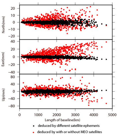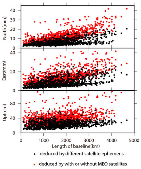 We analyzed the contribution of MEO satellites distribution on influencing BDS positioning performance due to currently incomplete constellation distribution, which will be fulfilled in 2020. With the same strategy of data processing in Section 2, we reprocessed BDS observations without four MEO satellites. The mean and RMS of baselines differences between BDS positioning results with and without MEO satellites are shown in Figure 8 and Figure 9 in red dots. Comparing to the impact from different ephemeris, the contribution from four MEO satellites is significant on influencing BDS positioning performance. The variation of baseline differences is amplified linearly with the increasing length of baselines, which is insignificant in the ephemeris comparison, thus indicating that the impact on the accuracy of BDS positioning results from ephemeris is stochastic. The RMS of baselines differences also linearly increase with the increasing length of baselines, which shows a similar pattern in the case of different ephemeris, but with larger amplification. The mean and RMS of baselines in differential position time series between BDS results with and without MEO satellites are shown in Table 4. The mean values are less than 1 mm for both north and up components, while it is 5.1 mm on the east component, which is considerable compared to the case of different ephemeris. All baselines are moving eastward without including MEO satellites, especially for baselines longer than 2500 km. The RMS of baselines differential time series is 12.0, 14.1, and 42.9 mm for north, east and up components, respectively. The average value of RMS without MEO satellites is almost two times larger than the case with MEO satellites included, and two times larger than the accuracy of BDS positioning too. The results indicate the utmost importance of MEO satellites in improving the accuracy of BDS positioning, and thus infer that the accuracy of BDS positioning may be improved with increasing the number of MEO satellites.
