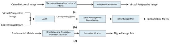 The block diagram of automatic stereo rectification for hybrid vision is shown in Figure 1. The proposed approach consists of three parts, including acquisition of the virtual perspective image in Figure 1a, calculation of the fundamental matrix in Figure 1b, and stereo rectification in Figure 1c.