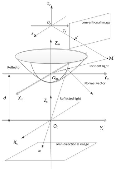 The configuration of the hybrid vision system in this paper is shown in Figure 2. It illustrates the point correspondence relation between an omnidirectional image and a conventional image. The hyperbolical mirror was chosen for the omnidirectional camera to ensure that it had a single effective viewpoint, which is a necessary condition for the generation of pure perspective images from the captured images. We placed the omnidirectional camera vertically with the conventional one. The vertical installation not only avoids the own occlusion of the system, but also has a large common field of view. There are three coordinates in the hybrid vision configuration—conventional camera coordinate , catadioptric coordinate , and omnidirectional coordinate . The projection center of the two cameras is , and . is the distance between the catadioptric coordinate and projection center . . and are the long and short axes of the hyperbolic mirror, respectively. The 3D point was projected to point to of the conventional image plane by linear mapping. It also projected to point of the omnidirectional image through the incident and reflected rays, which is nonlinear mapping. If the extrinsic parameters of the two cameras are known, the 3D point M can be determined uniquely by and .