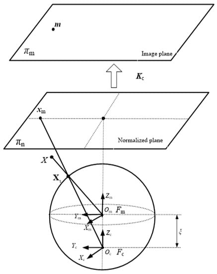 As described in [30], a central catadioptric projection is equivalent to two-step mapping via the unit sphere. As shown in Figure 3, is the origin of the catadioptric coordinate and is the origin of the camera coordinate. For a general omnidirectional camera, the optical axis was aligned to the line defined by and . Point in the 3D coordinate was projected onto a unit sphere located at the origin of the catadioptric coordinate, . In the coordinate of the sphere, . Then, the projection of on the normalized plane could be given by: