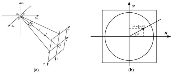 As shown in Figure 4a, the view angle of the virtual image was selected, where is the horizontal azimuth. As shown in Figure 4b, where the coordinate of a pixel is , is: