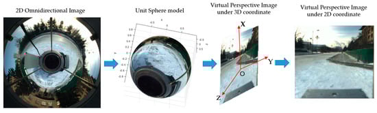 Equation (6) establishes the one-to-one correspondence between and . is the point in 2D coordinates, which can be derived from by simple coordinate transformation. An overview of virtual perspective image generation is shown in Figure 5. Thus, the virtual image which has the same intrinsic parameters with the conventional camera is derived.