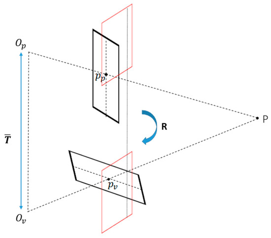As shown in Figure 6, and represent the projection center of the conventional camera and virtual perspective camera, respectively. The corresponding imaging planes are and . is a point in the three-dimensional coordinate. and are the point correspondence of in the two image planes. The plane defined by and is the epipolar plane. The line defined by and is the baseline. According to [29], the relation of the image pixel coordinates and the fundamental matrix is: