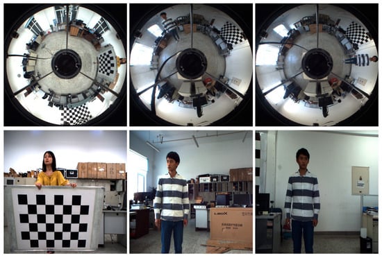 Figure 7 presents our experimental setup. Improved measurement accuracy can be achieved by adjusting the baseline distance. The hardware configuration of this experiment was a computer equipped with a dual-core Intel Pentium G2020 29 GHz, and 4 GB of RAM, running Windows 10. The system was implemented in VS2015 combined with OpenCV 2.4.9 and OpenGL 4.3. The cameras were synchronized via an external trigger. The parameters of the omnidirectional camera and the conventional camera are shown in Table 1. To verify the accuracy of the proposed rectification method, a stereo rectification experiment was performed.