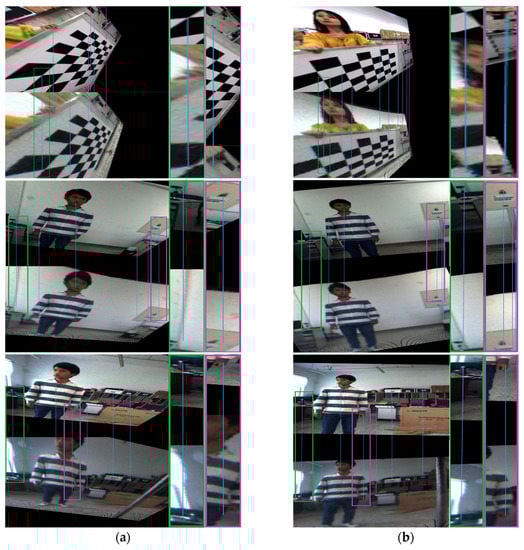 Stereo rectification results. The first row in each image is from the conventional camera. The second row in each image is from the omnidirectional camera. (a) The image pair with the rectification method in [27]; (b) the image pair with our proposed rectification method.