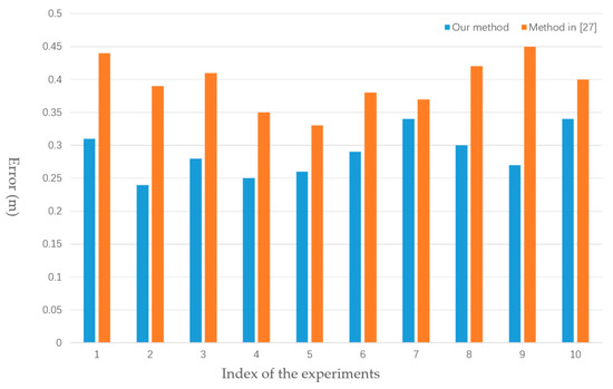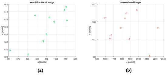 Stereo vision odometry is based on the parallax of two images. The accuracy of odometry represents the accuracy of the rectification method. Thus, we analyzed odometry accuracy in a simulated environment. As shown in Figure 10, we placed the omnidirectional camera at the origin. In other words, the camera coordinate was consistent with the world coordinate, while the conventional camera was put at . The parameters of the cameras were set to the same values as in Table 1. We performed ten groups of experiments where each had a different rotation and translation matrix. We placed ten points in 3D coordinates for each experiment. Captured points of one experiment in an omnidirectional image and perspective image are shown in Figure 11a,b, respectively. Ten points were used to calculate the and matrixes. The image pairs were rectified using our proposed approach and the method in [27], respectively. The vertical disparities of 10 corresponding points were derived. The distances between sample points and cameras were calculated by (17). is the camera focal length, and L is the length of the vertical baseline. In our simulated experiment, , . The value of the Y-axis of each point was used as a ground truth. The mean errors of distance in different orientations between cameras are shown in Figure 12. Compared with the method in [27], the mean error in each experiment decreased by 0.1–0.2 m using our proposed approach. It can easily be inferred that our proposed rectification approach is more reliable.