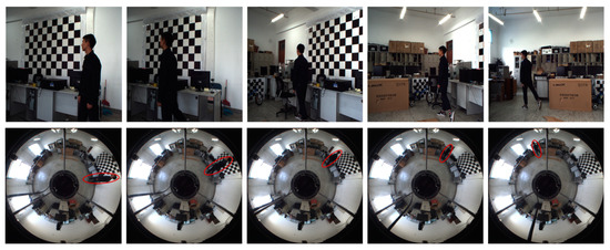 Five frames were randomly selected from the processing results, and are shown in Figure 13. It demonstrates that the angle from the omnidirectional camera can be sent to the conventional camera successfully, and the two cameras can cooperate with each other very well.