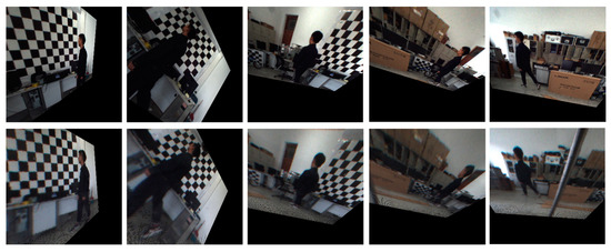 We used our proposed method to rectify image pairs, the results of which are shown in Figure 14. The comparison of the odometry results and the ground truth is shown in Figure 15 (the hybrid vision system was fixed at the origin). The average error distance is 0.317 m. The experimental results show that the error is far less than the target scale. We can conclude that the calculated trajectory is consistent with the ground truth, and our hybrid vision system can be used in surveillance tasks.